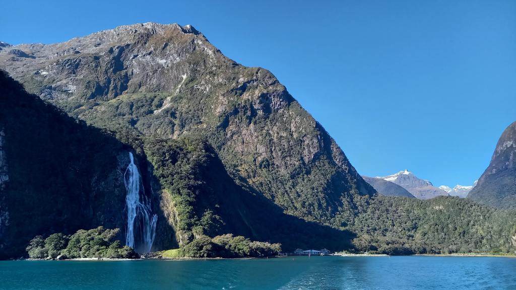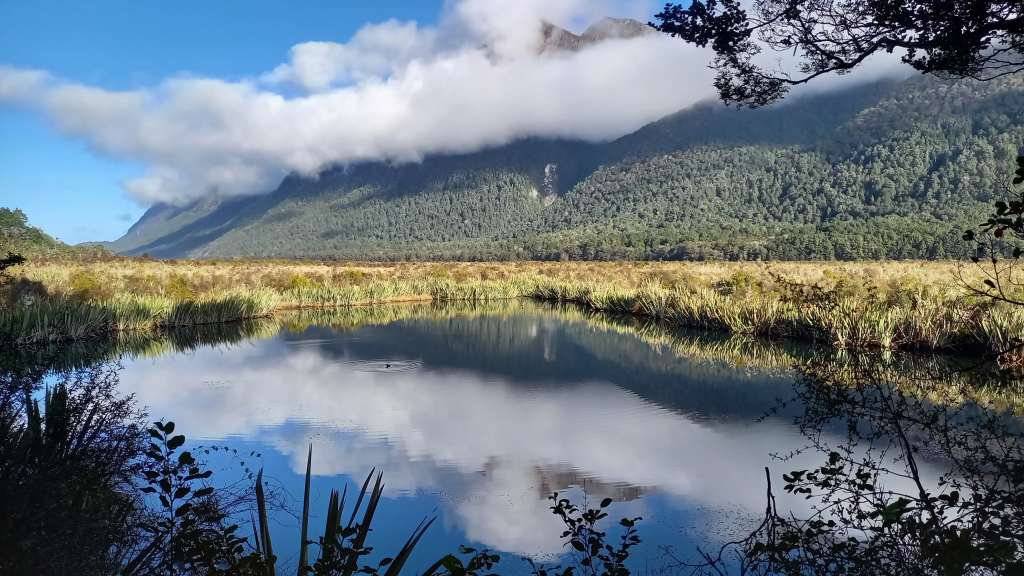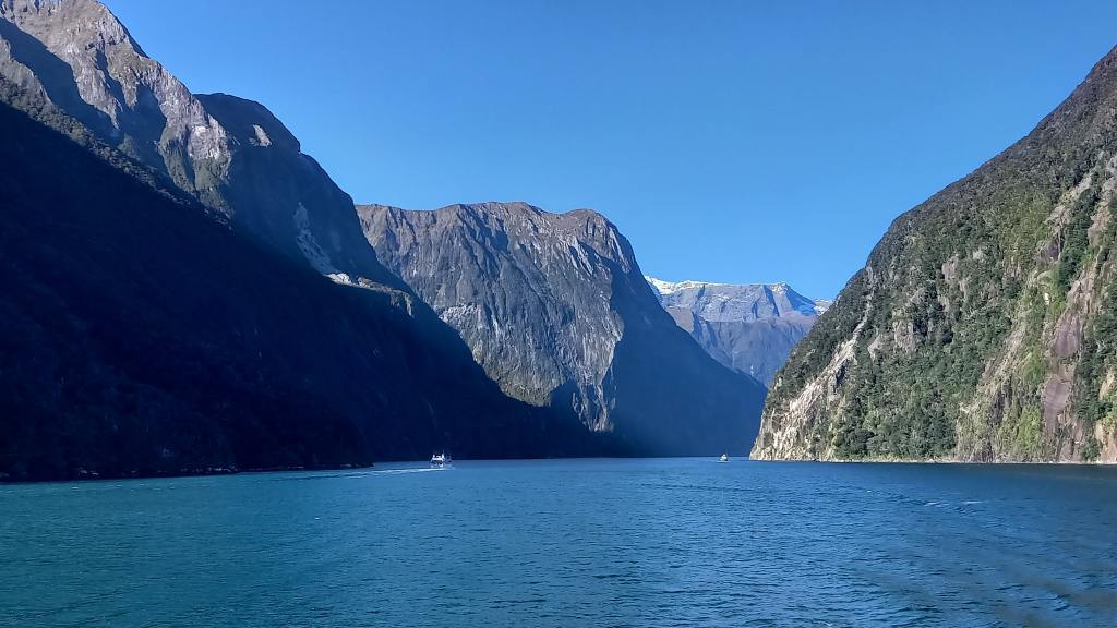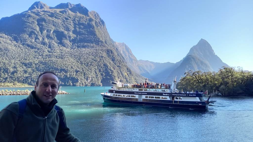 I had two full days in town, and my first one began with a 5.30am wake-up call for a full-day trip to nearby Milford Sound and back. Well, actually, it is nearby only as the crow flies – 40 miles away to the north-west. But difficult terrain, involving huge mountains, deep valleys, lakes and forests, means that to get there, the journey takes four hours one-way (six hours with the stopping points my tour included on the way there) along 180 miles of road that first goes south, then west, and then back up north again – definitely the long way round! The journey of course was just spectacular, and the coach-driver/guide was great in explaining everything to us and stopping in several places on the way, including the lakeside town of Te Anau, Mirror Lakes, and Monkey Creek. We first passed along the shores of Lake Wakatipu, then Lake Te Anau, before passing through the mile-long Homer Tunnel, and descending to sea level on the shores of perhaps New Zealand’s most famous fjord – the stunning Milford Sound, in the country’s expansive and mostly unvisited Fjordland National Park in the far south-west corner of the South Island.