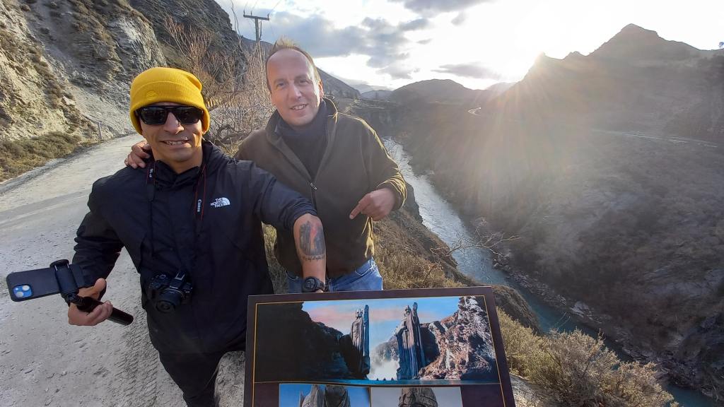 The next day was also a good ‘un! This was my second of two full Lord of the Rings day tours in New Zealand, this time visiting the South Island filming sites, with a great tour group of myself, a Mexican chap, and a newly-wed couple from Malta who were on their honeymoon. The North Island sites seemed more cosy, Hobbit-y places from the first film, while the South Island seemed home to the more rugged and windswept places from the second and third films. We visited the LOTR filming locations for Ithilien, Dunharrow, Isengard, Lothlorien, the Ford of Bruinnen, and my favourite – The Argonath on the River Anduin, along with the location for Beorn’s House in the second Hobbit film. In real life, these were around the small settlements of Glenorchy and Paradise at the north end of Lake Wakatipu, and Arrow Town just outside of Queenstown. Paradise was also the filming location for the very dark and highly unsettling “Top of the Lake” Kiwi-noir drama series directed by Jane Campion. We found out at the Argonath location that one of our tour members, the Mexican dude, had a large tattoo of these mighty statues on his arm. We all just had to have a picture taken with him, his arm and his tattoo at this location!