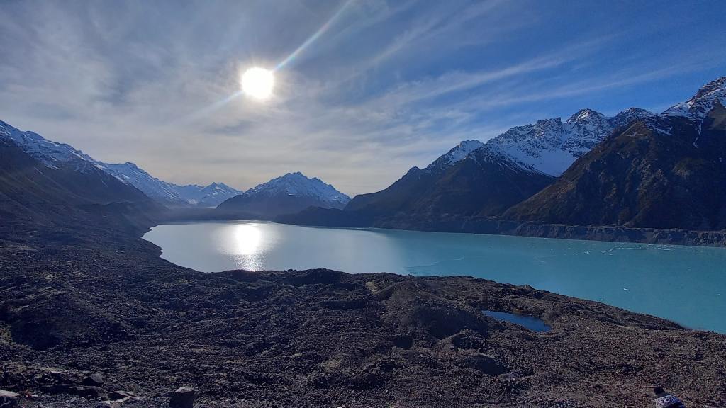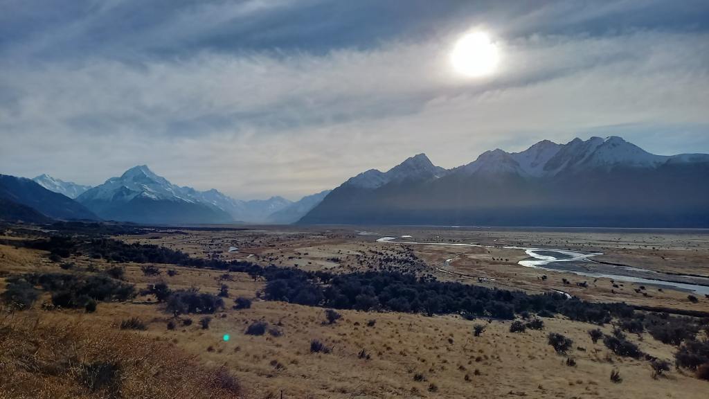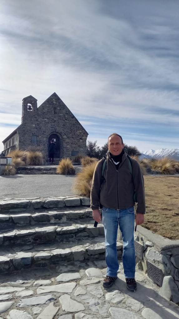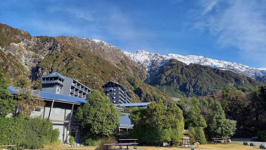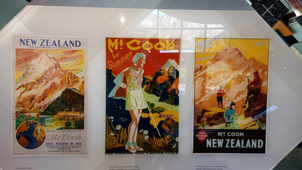 We first stopped off at various view points along the way to the Mt Cook National Park, and then its tourist hub Mt Cook Village for a bit. I was again really fortunate with the weather, with clear blue skies all day – apparently it is only one in three days that the visitor can view Mt Cook. I was so pleased to have travelled all this way, literally to the other side of the world, to be able to view the impressive jagged peak of New Zealand’s highest mountain, standing a mighty 3,724m above sea level. It was also fascinating to see the various artefacts, memories and displays dedicated to legendary Kiwi Sir Edmund Hillary in the Village, as Mt Cook had become his practice mountain before he became the first man to conquer Mt Everest in 1953. In actual fact, he was one of two – little is known of his Sherpa-guide Tenzing Norgay, and fascinatingly while we there, a film crew was in town filming an upcoming film about the latter chap’s life. It is called “Tenzing”, starring Tom Hiddleston and Willem Dafoe, and I had learned about it from a fascinating talk with a member of the film crew back in the Tekapo Springs the evening before. This chap had also worked on the LOTR films, and I have since spotted his name on one of the film’s end credits!