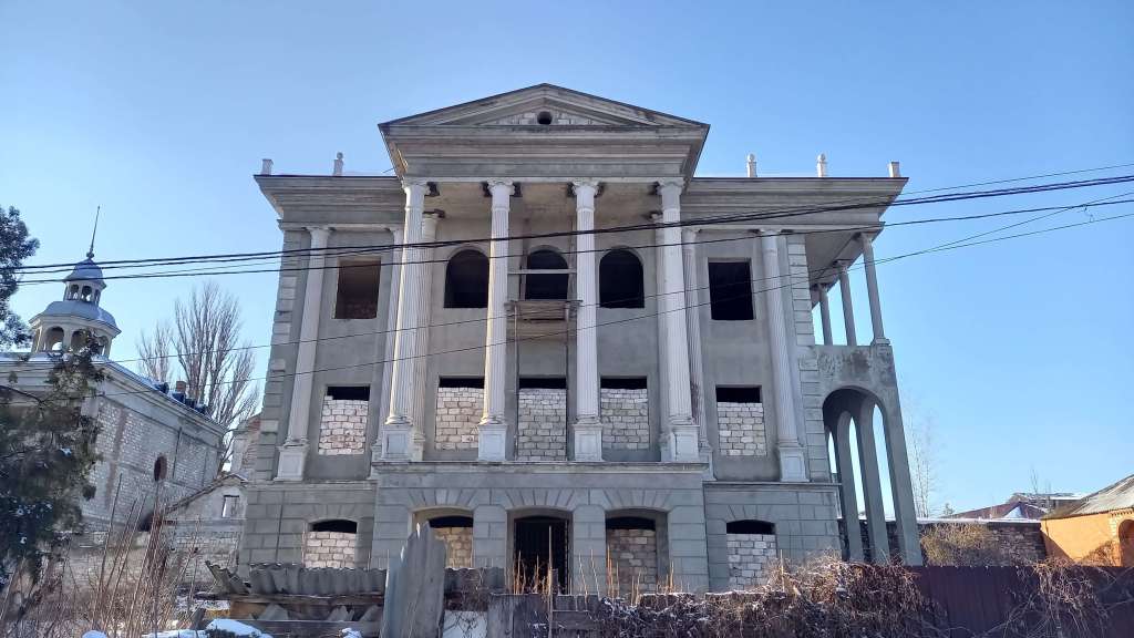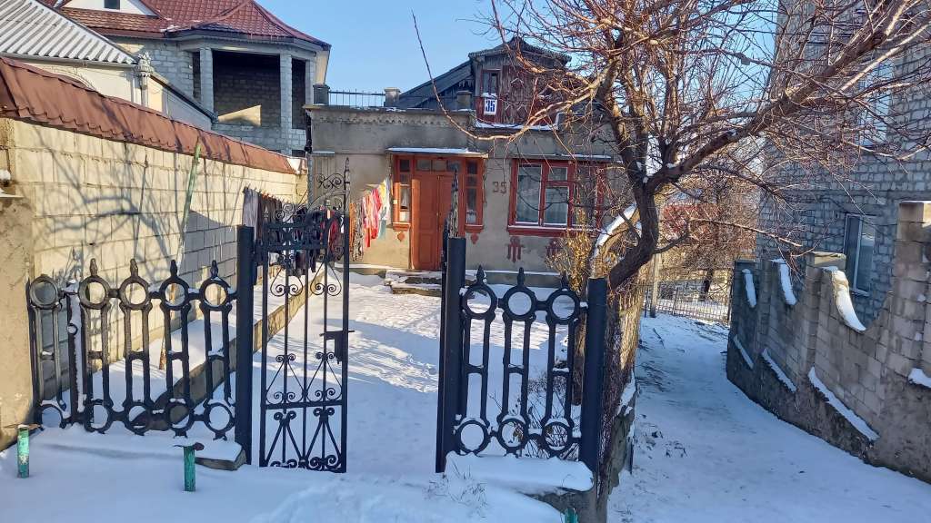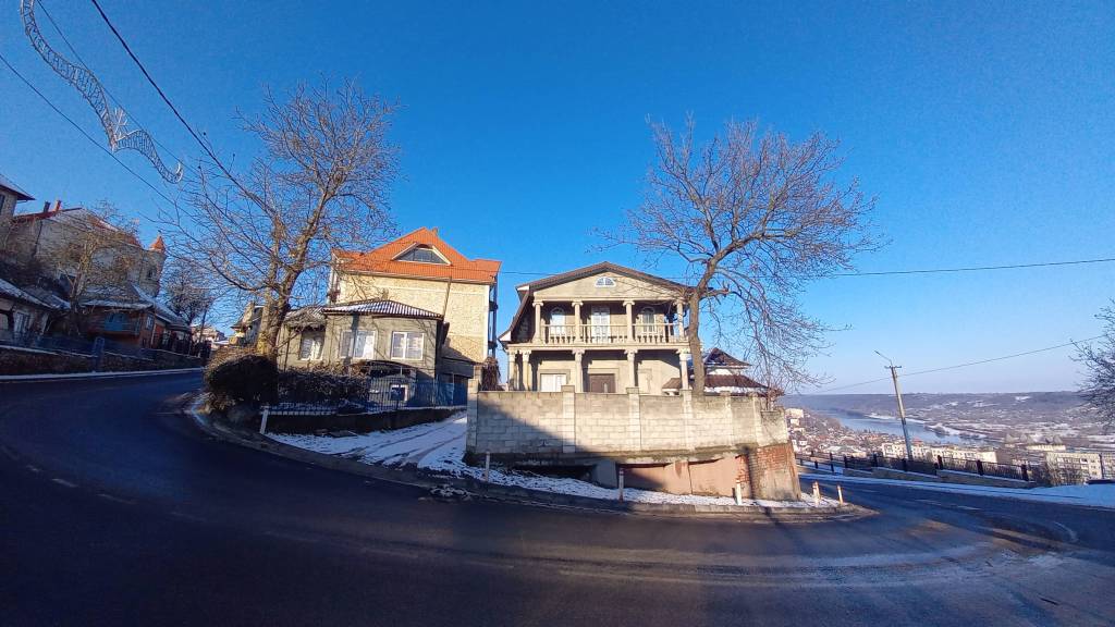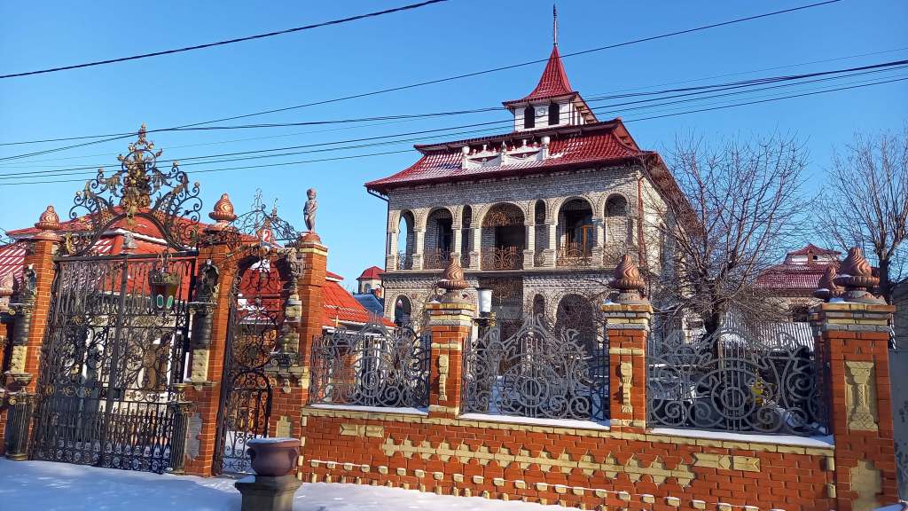 Then I headed for a walk up nearby Gypsy Hill. Soroca is known as the “Gypsy Capital” of Moldova – while gypsies form just 0.3% of the total population of the country, they make up around 4% here in Soroca. Many of them live up on this prominent hill with fantastic views over the city, Dniester River, and Ukraine below. The hill is famous for its wild, wonderful and fantastical houses built by the city’s Romany population, and wandering around I observed an eclectic mix of abodes – from one or two room shacks with frozen washing hanging up on lines, to grand palatial mansions with turrets, golden domes, elaborate gates, statues of lions and the like. What seemed particularly bizarre to me was the fact that most of them had not been completed, looking in various states of completion, despite also looking lived in. Windows were often boarded up, yet signs of life were around, visible on this day by the footprints in the snow which could be seen going in and out of most of the residences. I wonder if they just do their houses up as they go along, whilst living in them in the meantime. There were still a fair few completely abandoned ones knocking around, in various states of disrepair and ruin. It was a bizarre and fascinating place. As mentioned, the place is up on a hill, meaning the walk up there and back down again was a little precarious and slippery in places to the snow and black ice.