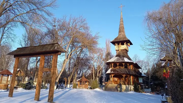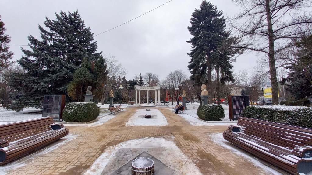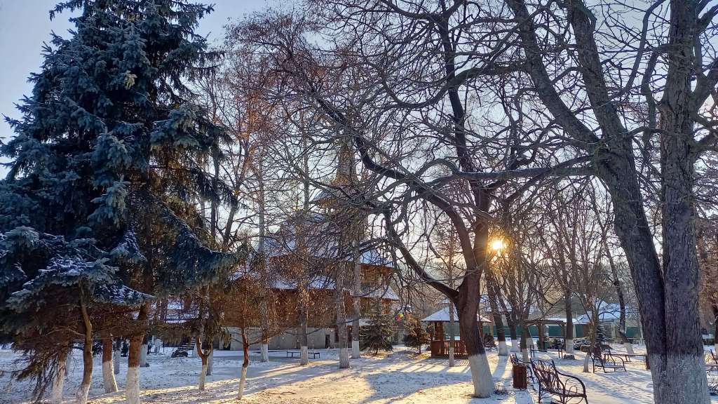 Finally, back in town again, I walked down the delightful tree- and cottage-lined central Stradă Independenței to the equally delightful Holy Martyrs of Brancova Church a few blocks south of Grigore Vieru Central Park. This is an absolutely exquisite wooden church, built only in 2012, but destined I think, along with Soroca Fortress and Gypsy Hill, to be one of the town’s highlights should it ever mark itself on the Moldovan tourist trail, if one ever were to exist. Dedicated to Prince Wallachia, four of his sons, and his friend and treasurer, who were all martyred in Istanbul in 1714 by the Ottomans for refusing to renounce their faith, the martyrs are considered saints by both the Romanian and Russian Orthodox Churches. Unfortunately the wooden church was not open to be able to visit inside, but just like the Fortress, it was still a delight to see it from the outside. Along with the surrounding wooded park and gorgeously sunny day, it was made infinitely more beautiful again by the white winter wonderland that had just arrived that morning.